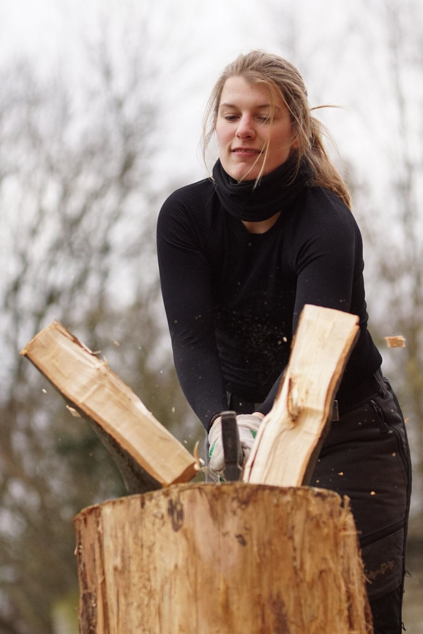 So wie hier. Der Fokus der Schärfe liegt dabei auf dan zu spaltende Holzscheit. Schaut mal genau hin …, eine gewisse Dynamik liegt darin. Für den „Holzhacker“ habe ich eine leichte Unschärfe gewählt. Trotzdem ist die Entschlossenheit und Kraft eindeutig zu sehen.
